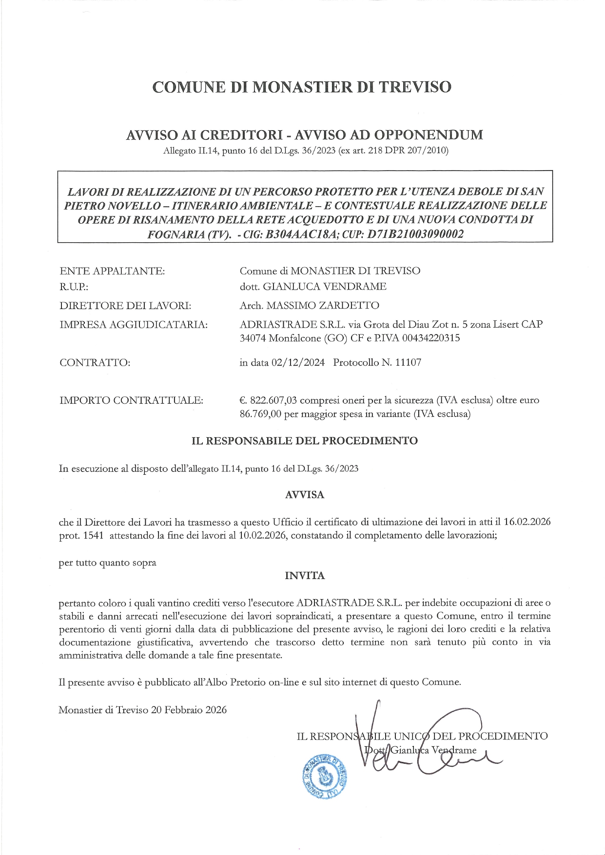 Si invitano eventuali soggetti che vantino crediti nei confronti dell’impresa esecutrice ADRIASTRADE S.R.L., per occupazioni o danni connessi all’esecuzione dei lavori, a presentare al Comune la relativa documentazione entro 20 giorni dalla pubblicazione del presente avviso.