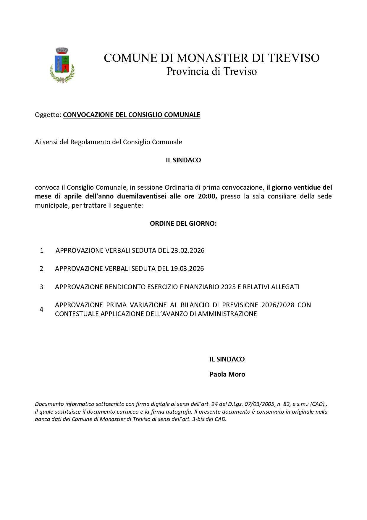 E convocata la seduta di Consiglio Comunale in data 22.04.2026 ore 20:00